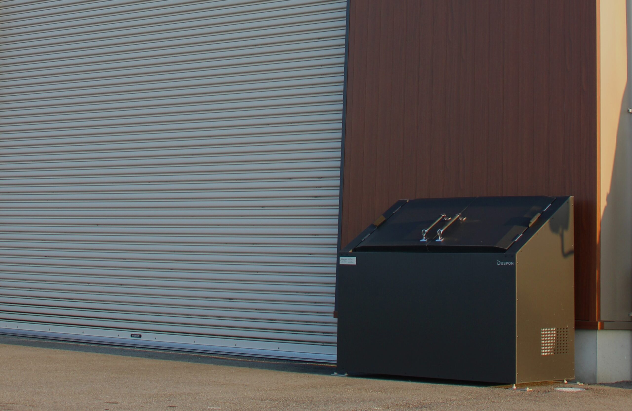 ダスポン設置前は工場内に乱雑にゴミ袋が置かれており、視界に入るのが嫌でゴミをきちんと置いておきたいと思い、2024年4月にダスポン DSシリーズを導入されました。ダスポン DSシリーズは、地区や集合住宅など、多くの方々の利用に耐えうる収納力を備えたゴミステーションです。トルクヒンジを装備しているので、一定の角度で扉を固定。扉を全開にしたり、扉を片手で抑えたりする手間がなく、安全に使用できます。