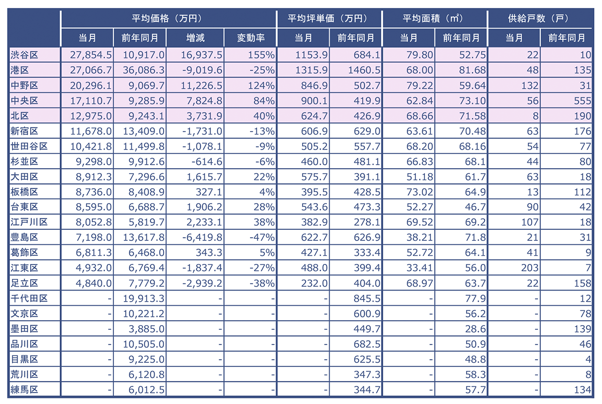 東京23区の各行政区毎に、平均価格、平均坪単価、平均面積、供給戸数をまとめました。当月の平均価格が大きい順に表示しています。