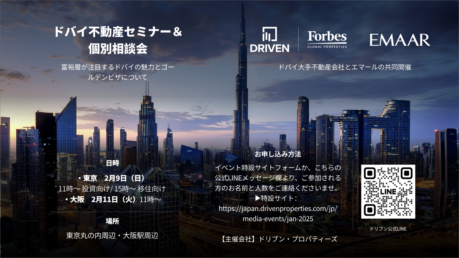 Forbes グローバル・プロパティーズに名を連ねる、大手不動産仲介会社ドリブン・プロパティーズ(Driven Properties LLC 本社:ドバイ CEO:アブダラ・アラジャジ)は、ドバイ不動産セミナーを2月に東京・大阪にて開催(参加費無料)いたします。富裕層が集まる都市ドバイについて、ドバイ不動産の魅力と成功する投資ポイント、ゴールデンビザや移住などについてを含んだ内容でお届けいたします。