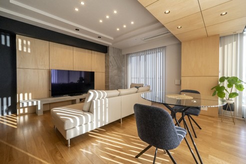 中古マンションだからこそ手に入れられた、十分な広さと大きなルーフバルコニーを備えた物件をホテルライクにリノベーションした事例。生活動線の良い3LDKの間取りや折り上げ天井など既存の部分も活かしながら、リノベーションにより内装デザインに一新。キッチンの背面には和モダンなホテルをイメージした木の縦格子をあしらい、ひとつの家具のような存在感を出しています。玄関や廊下、洗面室、キッチンの天井や壁は締め色として、グレーのタイルや黒のクロスを採用し、明暗のメリハリのある空間に仕上げました。