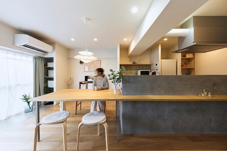 2,3年前と比べ、カジュアルなリノベーションが減り、グレージュやピンクベージュなど落ち着いた色を使ったホテルのような上質な雰囲気を希望される方が増えました。建具は壁と一体にして目立たせず、家具やインテリアを引き立てるデザインがトレンドです。間取りや内装を家具に合わせて設計するなど、家具にもこだわりを持って、造作家具や造作キッチンを選択される方も多く見られました。