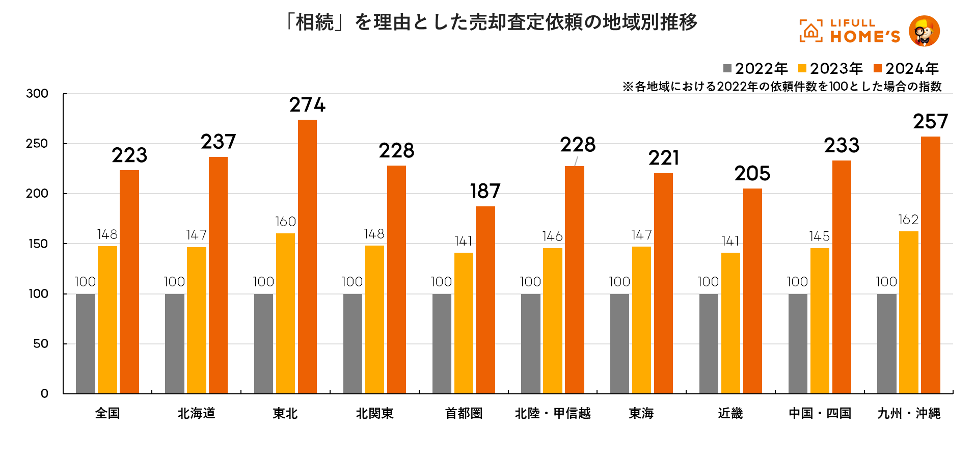 3年間で「相続」を理由とした売却査定依頼の件数(2022年の件数を100とした場合)は、全国で2.30倍でした。最も件数が伸びたのは東北の2.74倍で、九州の2.57倍、北海道の2.37倍が続きます。