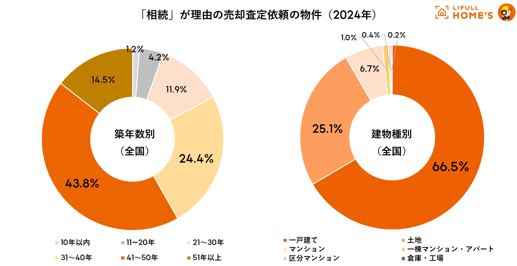 売却検討の物件は「築41~50年」が最多、「築31年以上」は8割超を占める。建物種別は「一戸建て」が66.5%にも。