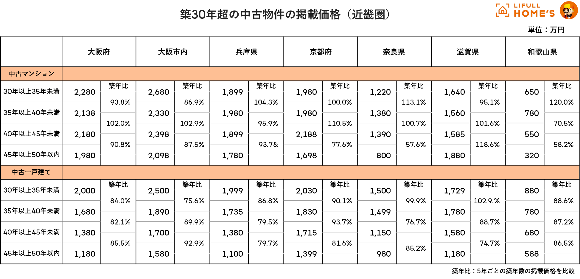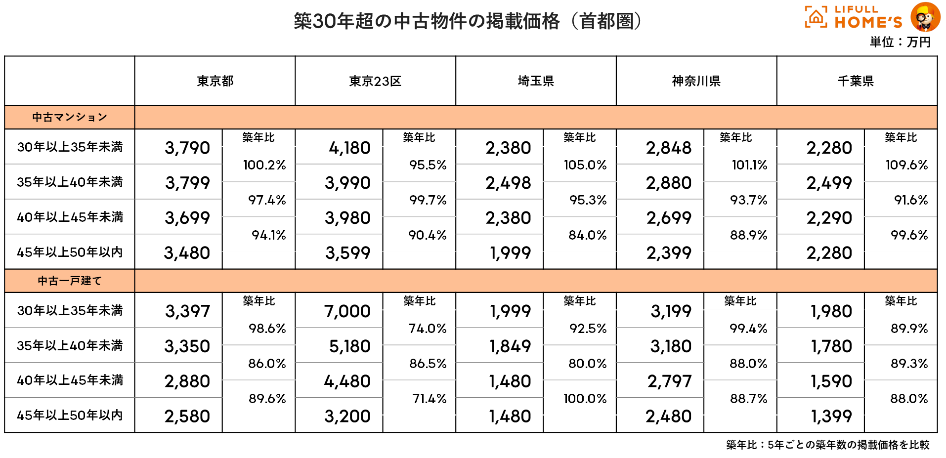 一般的に築年数が経つにつれ価格相場は下がる傾向にありますが、LIFULL HOME’Sで掲載された30年以上の中古物件の価格相場においては、地域や築年数、物件種別によって下落幅は一定ではないことが分かります。