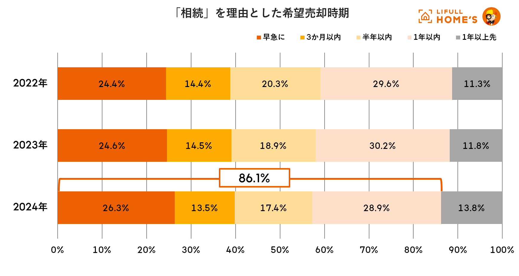 「相続」を理由とした希望売却期間は約86%が「1年以内」という回答も、「1年以上先」は微増に。