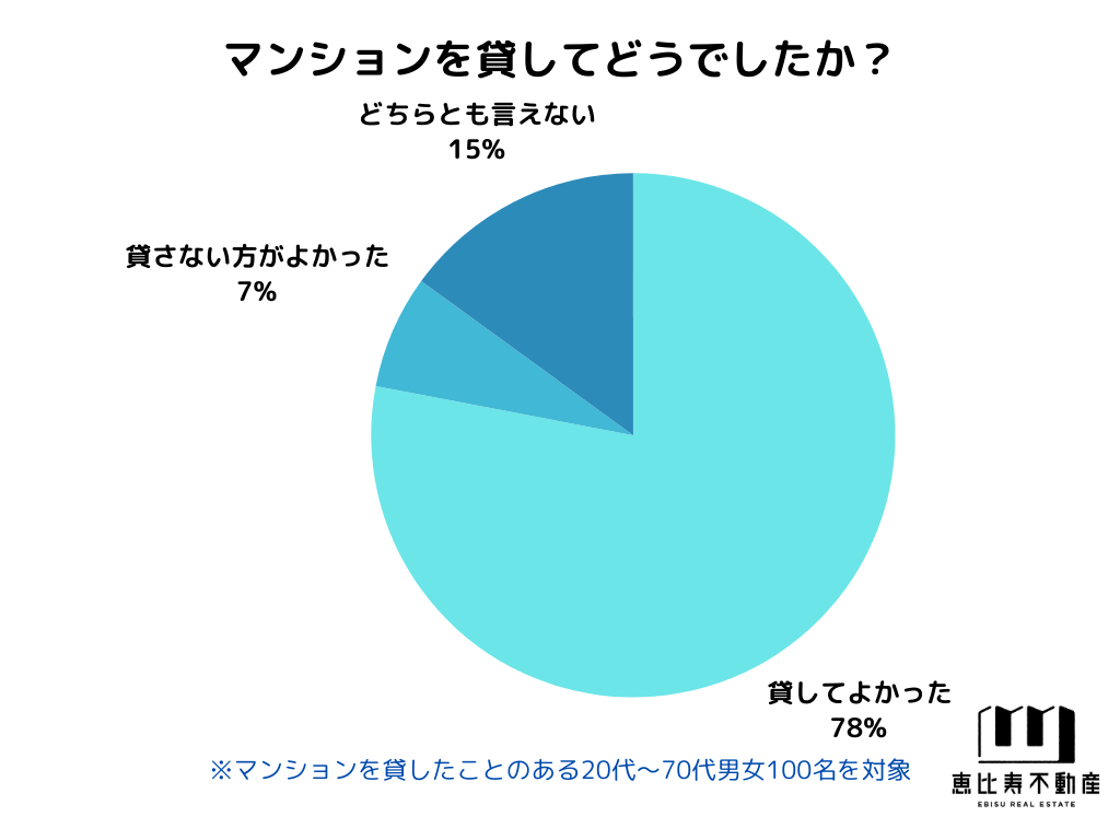 マンションを貸している20代〜70代の男女100名の方に、結果的にマンションを貸してよかったか聞いたところ78%の人が「貸してよかった」と回答しました。それぞれの意見を紹介いたします。