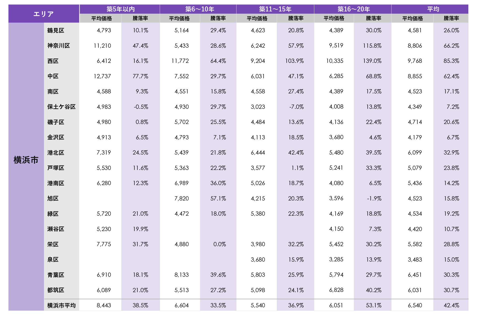 横浜市では、西区の平均価格が9,000万円を上回りました。平均騰落率も西区が最も高く新築分譲時プラス85.3%で、横浜市で唯一80%を上回りました。神奈川区の築5年以内、西区の築6~10年と築16~20年、中区の築5年以内では平均価格が1億円を上回りました。平均騰落率では神奈川区の築16~20年と西区の築11~15年、築16~20年で平均騰落率がプラス100%を超えました。みなとみらい地区をはじめとする沿岸部のタワーマンションが騰落率を引き上げる要因になっています。