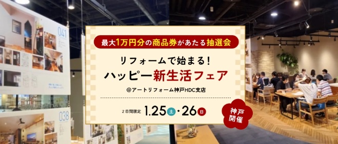 全国でリフォーム・リノベーション工事を年間6,500件以上手がける株式会社アートリフォーム(本社:大阪府吹田市、代表者:代表取締役社長 大本哲也、以下「アートリフォーム」)は、2025年1月25日(土)~26日(日)にかけて、旗艦店舗であるアートリフォーム神戸HDC支店(神戸市中央区)にて<リフォームで始まる! ハッピー新生活フェア>を開催致します。