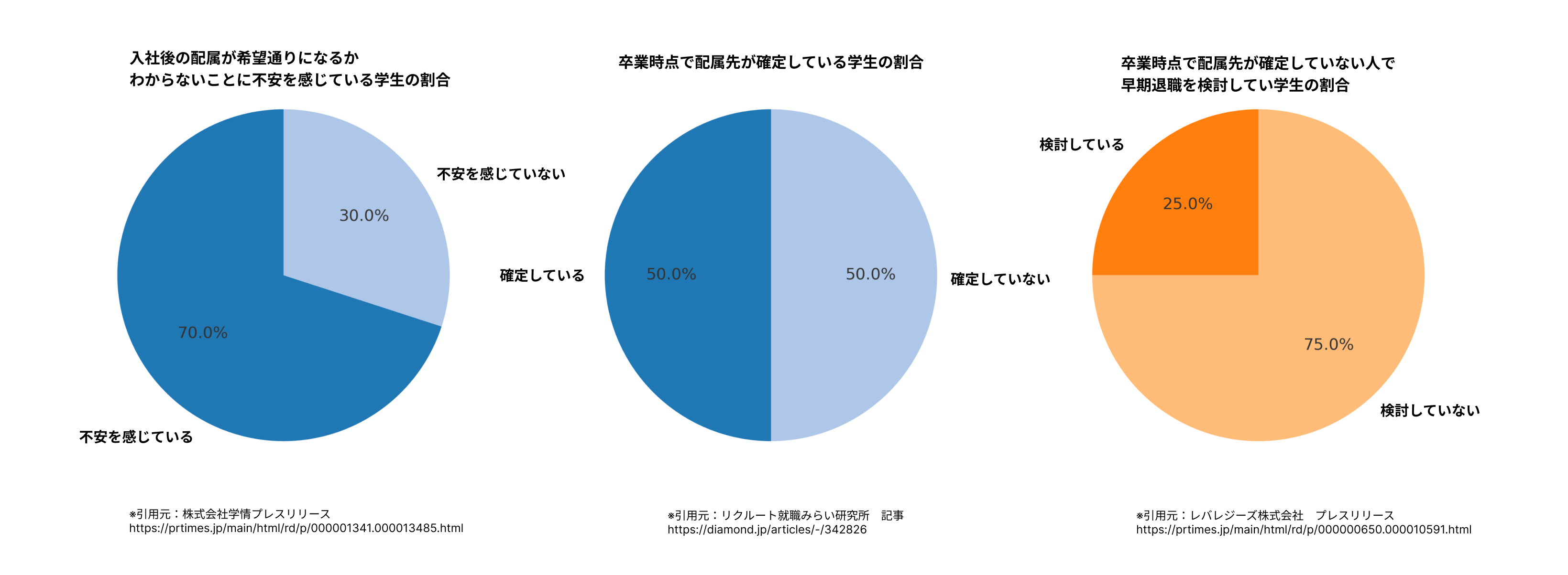 2024年4月に株式会社学情が実施した調査によると、新社会人の約7割が、入社後の配属が希望通りになるかわからない「配属ガチャ」への不安を抱えていることが明らかになりました。また、リクルート就職みらい研究所の調査・レバレジーズ株式会社の調査では、卒業時点で入社後の配属先が確定していない学生が半数以上にのぼり、そのうち4人に1人が早期退職を検討しているという結果が出ています。
