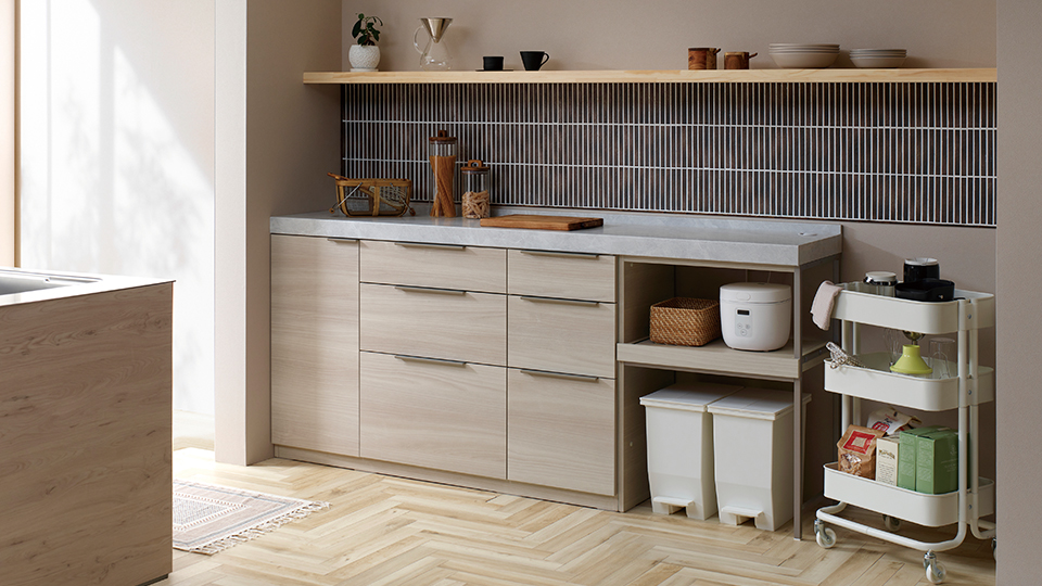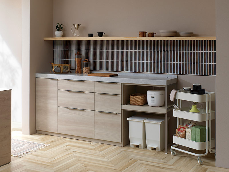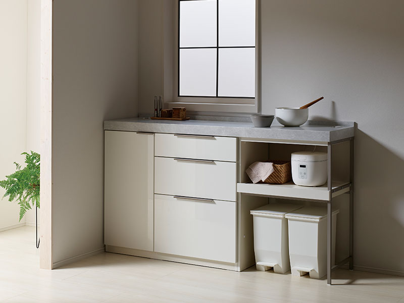 収納アイテムと天板を選んでレイアウトするキッチンカウンター