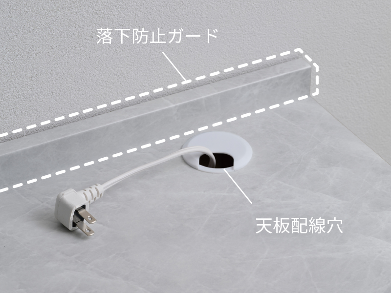 天板の両端には天板配線穴があるので、家電のコード類をまとめて配線できます。