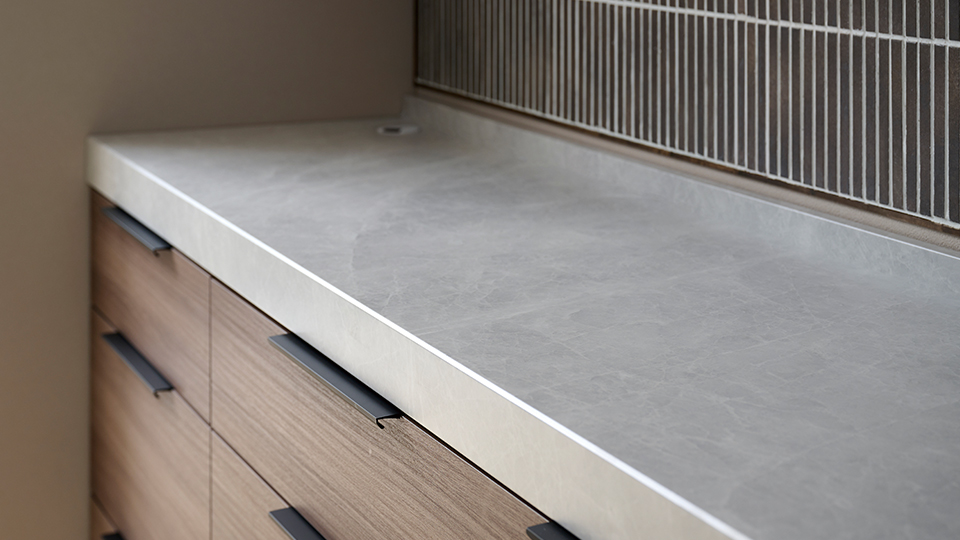 厚さ60mmの重厚感あふれるカウンター天板には、耐久性に優れたメラミン化粧板を使用。