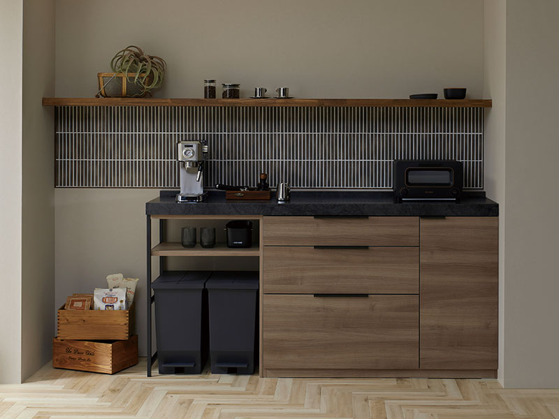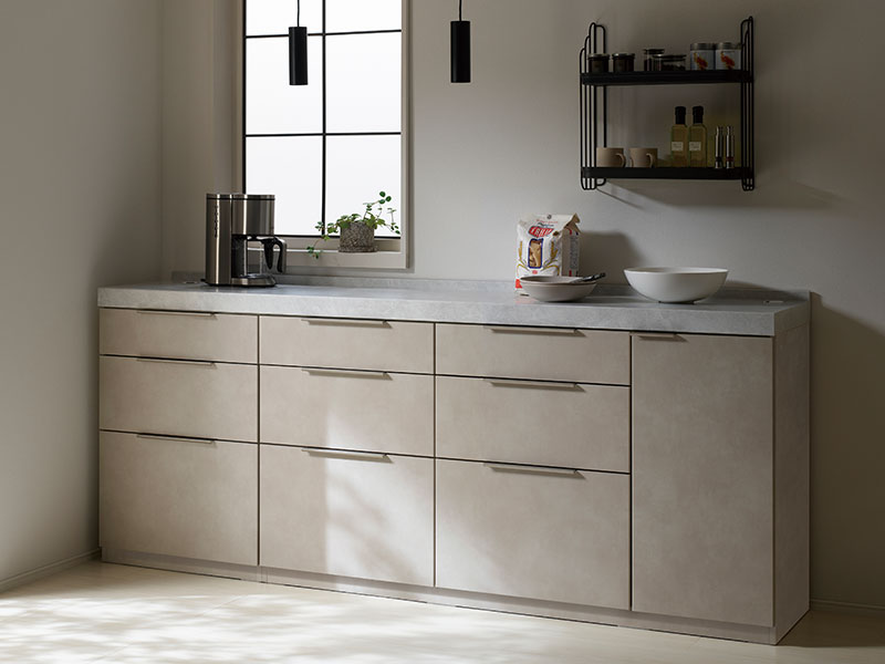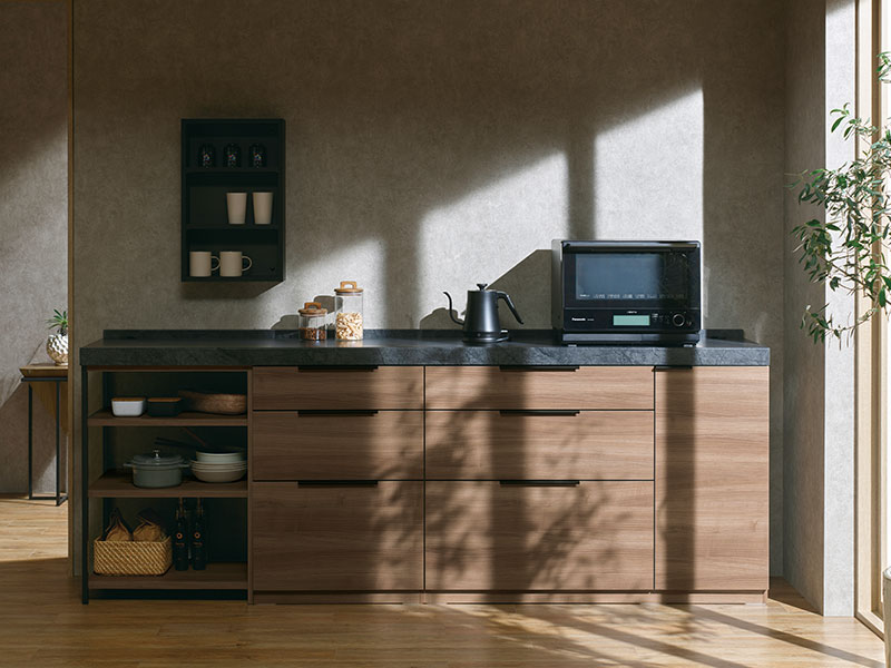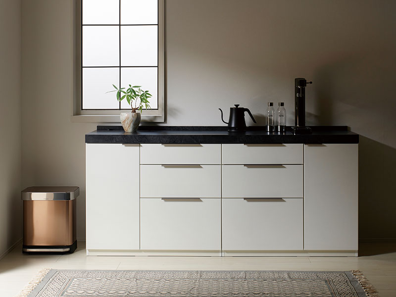作業台スペースを最大限に活用できるカウンター型のキッチン収納「LCシリーズ」は、組み合わせ次第で多彩なレイアウトが生まれ、多目的なシーン、テイストに対応できます。