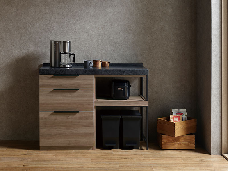 LCシリーズは、収納仕様・サイズ・色柄の異なる収納キャビネットを組み合わせ、天板とセットでご使用いただくカウンター型に特化したキッチン収納です。