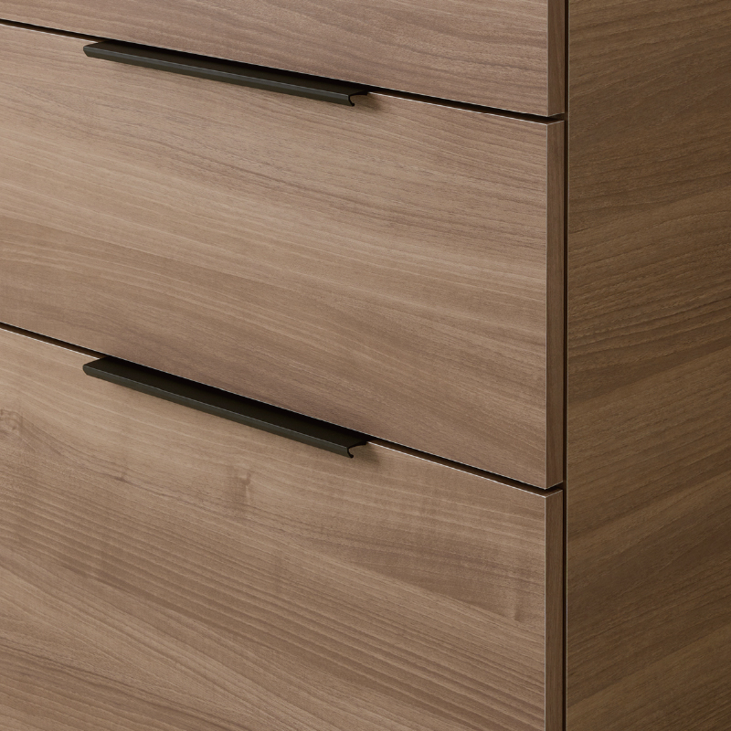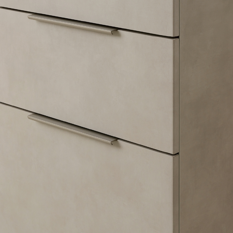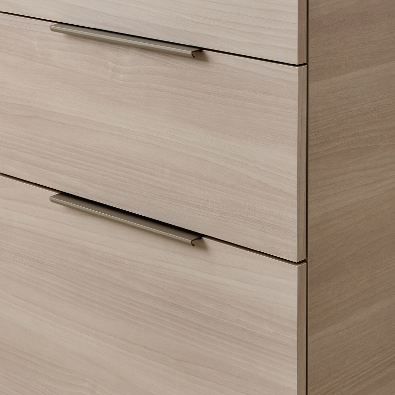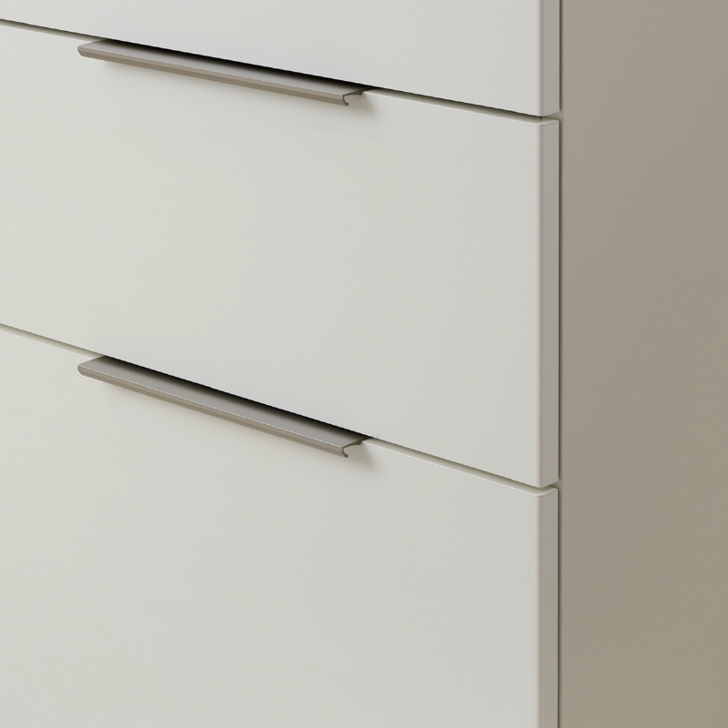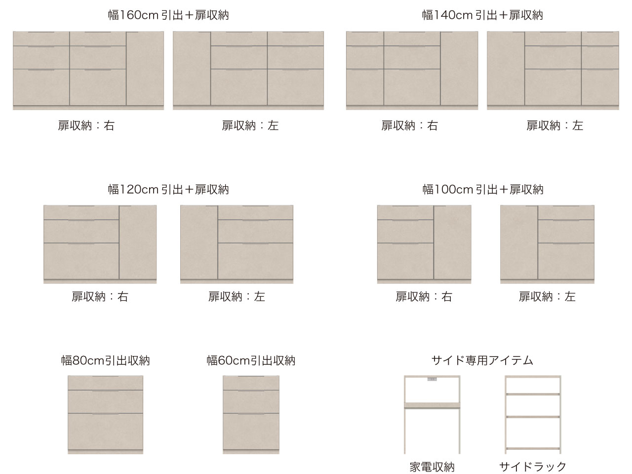 扉収納の位置が異なる「引出+扉収納」4サイズ、「引出収納」2サイズに加え、サイド専用アイテムとして「家電収納」「サイドラック」をご用意しています。