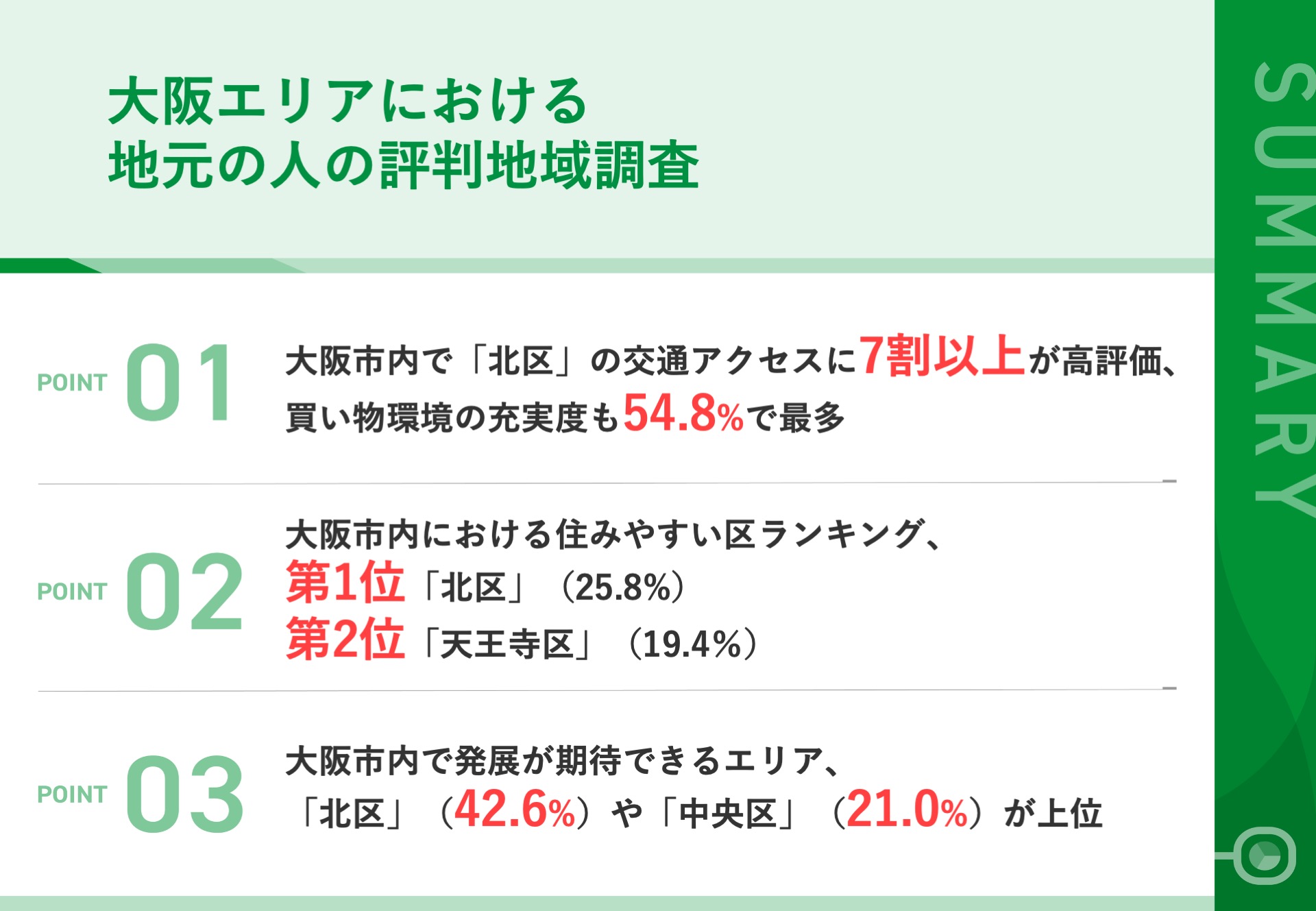 01|大阪市内で「北区」の交通アクセスに7割以上が高評価、買い物環境の充実度も54.8%で最多