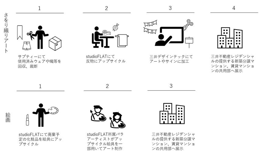 本取り組みは、三井不動産レジデンシャルに加え、多数のスポーツチームのウェア、幟などの印刷や会場装飾を手掛けるサプティー、2021年からパラアートサブスクリプションサービス「PARA ARTサブスクby studio FLAT」等で三井不動産レジデンシャルと協業しているstudioFLAT、反物の加工等を担う三井デザインテックの4社により実現した独自の取り組みです。4社の連携により、スポーツ競技場を彩った廃棄予定の幟などを回収し館内サインに生まれ変わらせる、廃棄化粧品を絵具の一部として利用した絵画を選定するなど、持続可能な社会の実現にも貢献いたします。