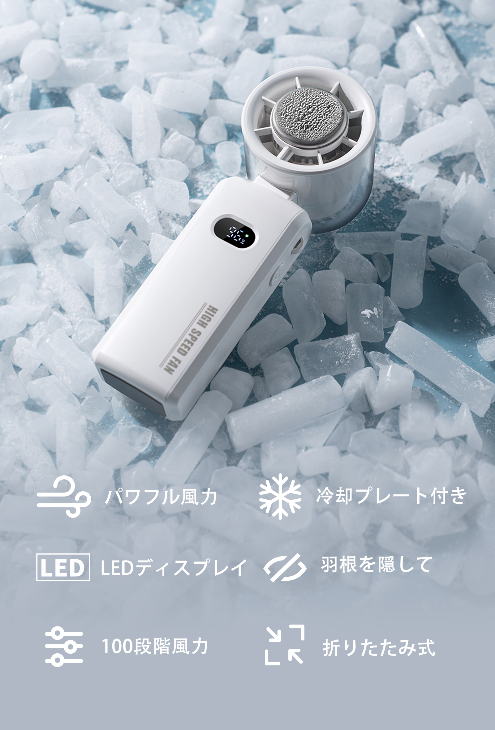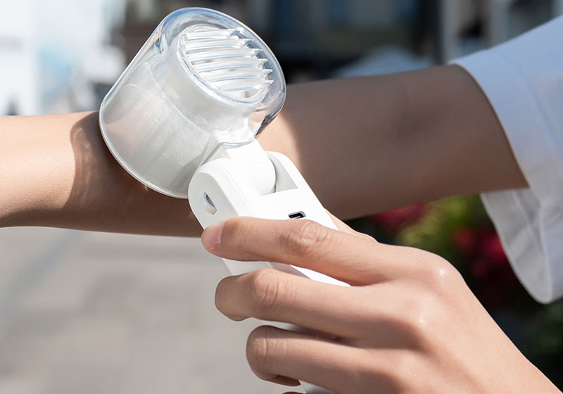 冷却プレートを搭載した携帯扇風機は、ただの送風だけでなく、送風中に冷却スイッチを押すと、プレートが瞬時に冷たくなります。