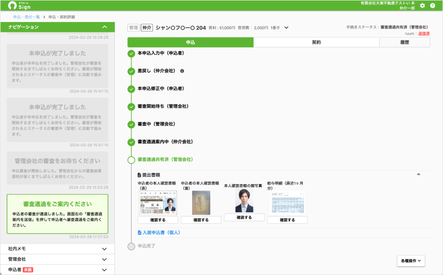 初見でも直感的でわかりやすいデザイン設計。お部屋を借りる方、お部屋のオーナー様、仲介会社様、管理会社様など多くの関係者が関わる賃貸取引の申込/契約で現在の対応状況など、次のアクションが一目でわかるナビゲーション機能や同一画面で関係者とチャットができる機能を搭載