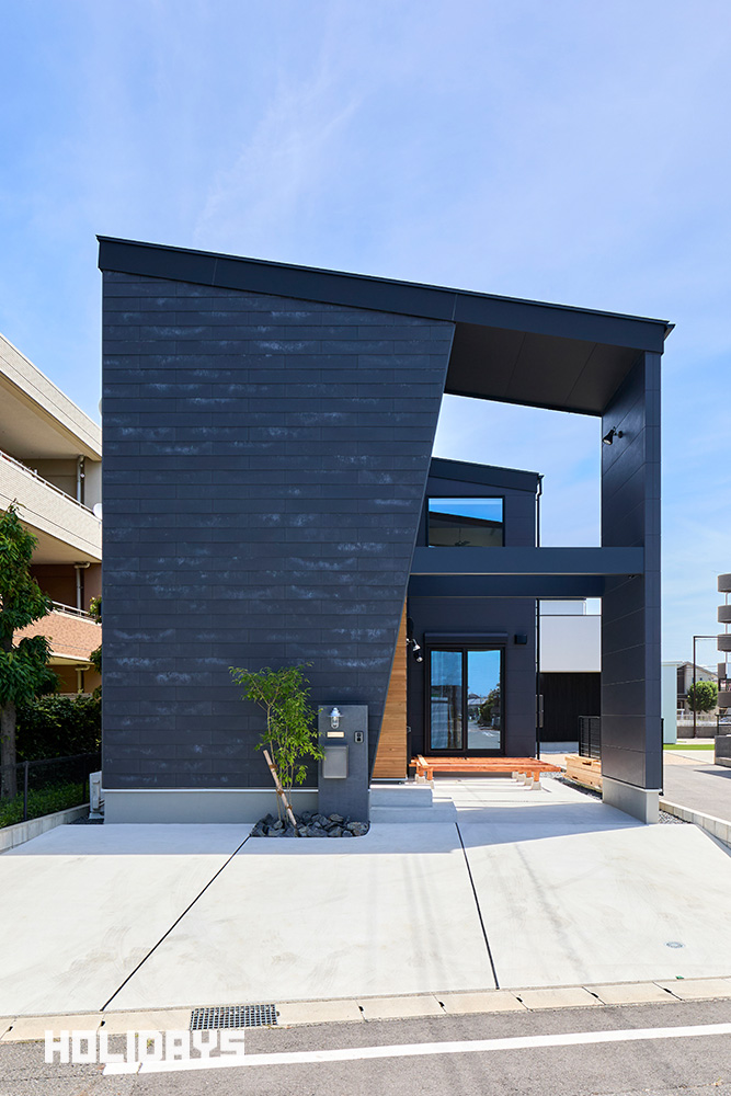 正面のファザードにはSOLIDOを大きく使用しました。凹凸感が特徴的な外観はスタイリッシュでかっこいい印象に仕上がっています。また玄関の一部に木調のアクセント外壁を採用することで、斜め壁から覗くデザインがアクセントになっています。