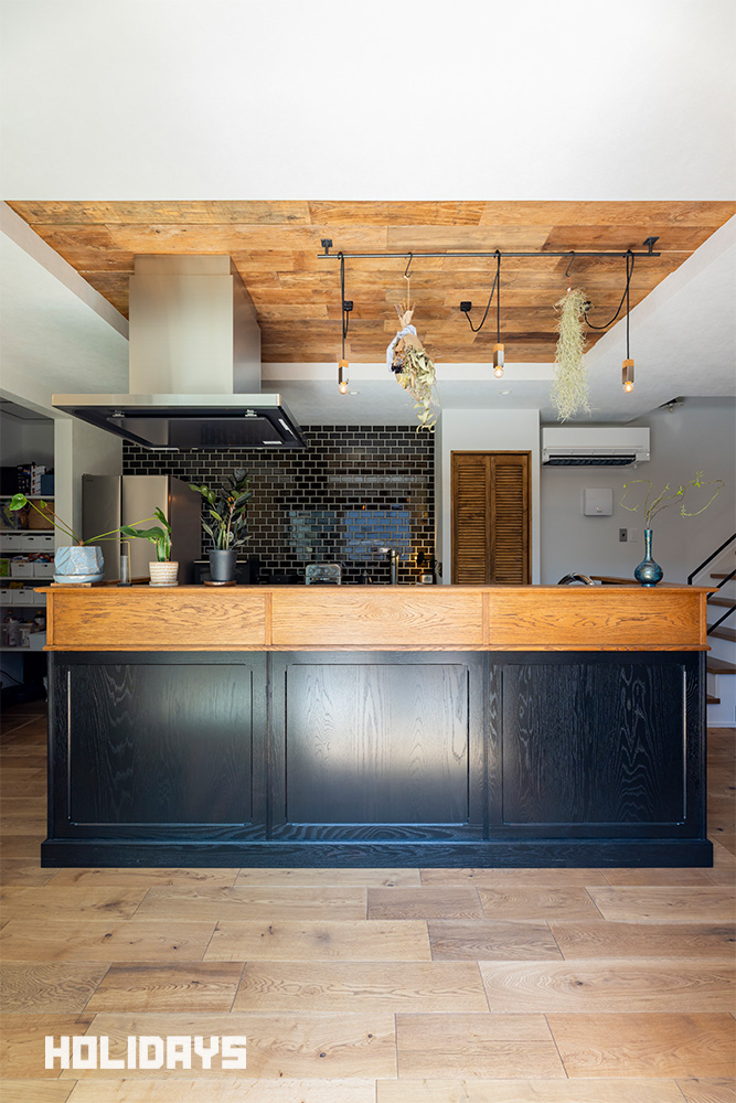 キッチン周りには造作で腰壁を設えました。キッチンの手元を隠し、生活感が見えないよう高さを工夫しています。ブラック塗装が良いコントラストになっておりオーク材の風合いが室内ともマッチしています。また無垢の床に合わせてキッチンの天井にはお施主様こだわりの古材のパネルを貼り上げました。