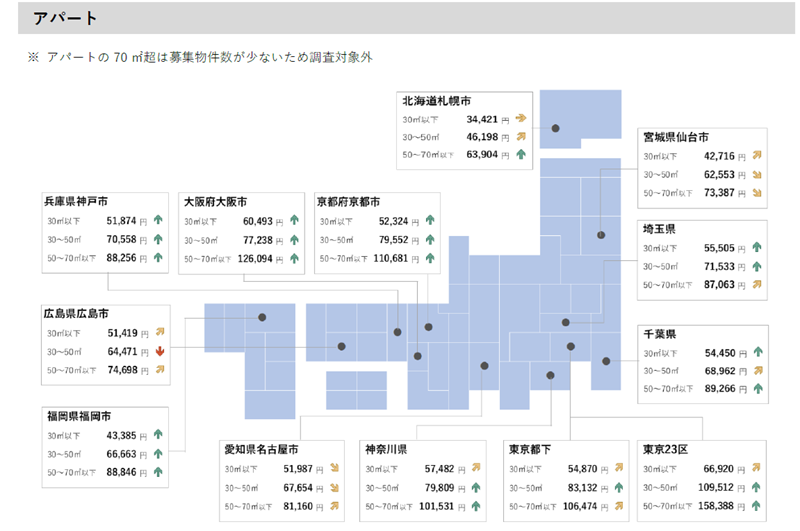 ・コメントでは、30㎡以下を「シングル向き」、30㎡~50㎡以下を「カップル向き」、50㎡~70㎡以下を「ファミリー向き」、70㎡超を「大型ファミリー向き」としています。