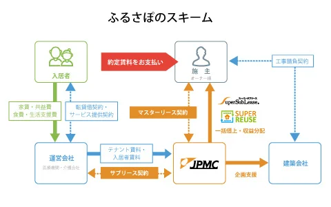 このような中、JPMCのシニアハウス事業部では「ふるさぽシリーズ」として、全国に広がるJPMCのネットワーク(建築業者・介護事業者)を通じて「有料老人ホーム・サービス付き⾼齢者向け住宅」の①事業判断時のエリアマーケティング、②建築プランニングの助言・監修、行政機関折衝補助、③運営にあたっての運営介護事業者(以下「FP(ふるさぽパートナー)」)の選定、④運営開始後の施設運営サポートまでトータルコーディネートを行い、さらに、物件をサブリースすることによってオーナー様の安定収入を実現してまいりました。