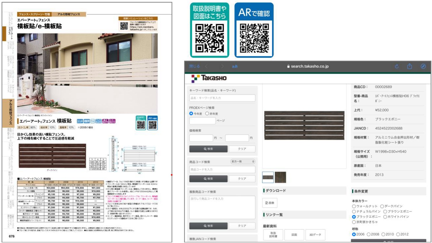 スマートフォンやタブレットのカメラ機能を用いて、WEBブラウザ上で動作するAR(WEB AR)にアクセスできる二次元バーコードの掲載に加えて、本カタログでは取扱説明書や図面などの商品情報を一元管理する「タカショー データバンクシステム」へのリンクも配置。カタログ紙面では表現しきれない詳細な商品情報に素早くアクセスできることで、プロユーザー様の生産性向上に貢献します。