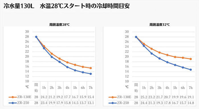 水温が高いほど温度が下がりやすく、水温が低くなるにつれて冷却速度は変化いたします。