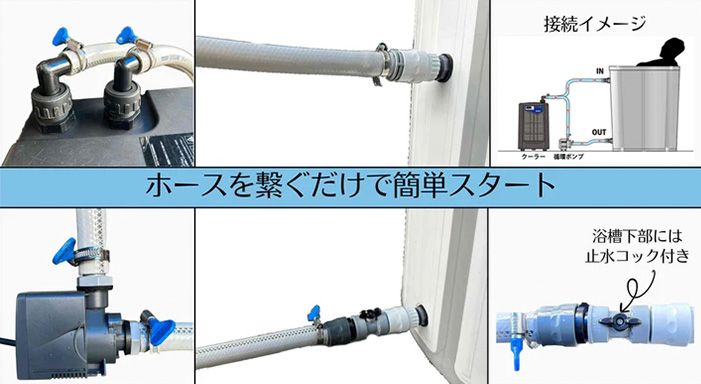 クーラーと循環ポンプ、循環ポンプと浴槽をホースで繋ぐだけなので、機械や配管などが苦手な方でも簡単に接続が可能です。浴槽側にはワンタッチ接続パーツをつける事で浴槽の取外しが容易に行えます。また、浴槽下側にコック付き接続パーツをつける事で排水も楽々行えます。
