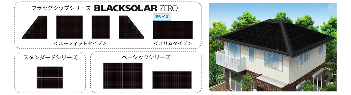 1.<BLACKSOLAR ZEROシリーズ>長方形のスリムタイプ登場により、従来は難しかった狭い屋根スペースへの設置が可能となり、設置容量の向上を実現