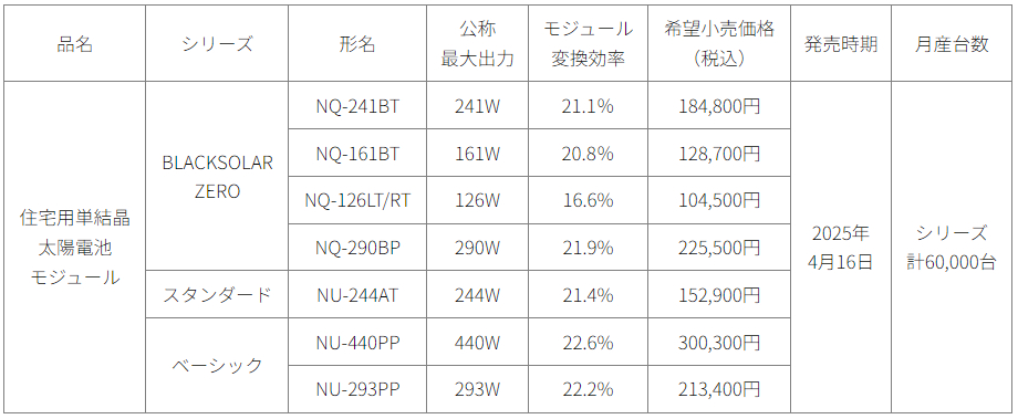 また、新製品の全機種で温度特性(※1)に優れた「N型高効率セル」を採用。モジュール変換効率を当社従来機比(※2)で0.3~1.4ポイント向上しました。