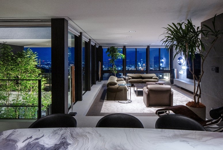 効率的な導線を確保しながらも雑多な部分が来客の目に触れないゾーニングとなっており、中央のライトコートにより建物全体に光が引き込まれる。 ライティングにおいては生活に必要な明るさを十分に確保しつつ、眺望を取り込む大開口窓への光源の映り込みをなくすことでドラマチックな陰影がつくよう計画した。陽が沈むにつれ輝き始める夜景が一面に浮かび上がる。日常でありながらも非日常に身を置ける上質な空間を目指した。