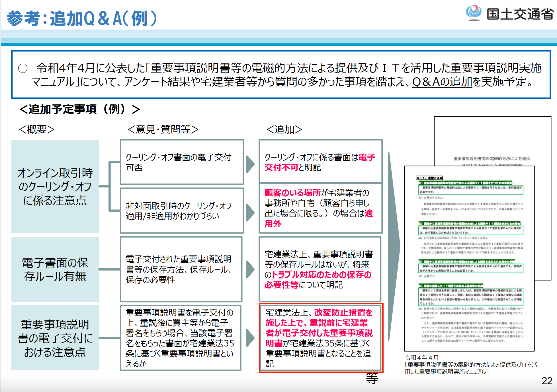 2022年5月の宅建業法改正により、不動産取引における「電子契約」が解禁され、国土交通省から「重要事項説明書等の電磁的方法による提供及びITを活用した重要事項説明実施マニュアル(令和4年4月)」が発行されました。