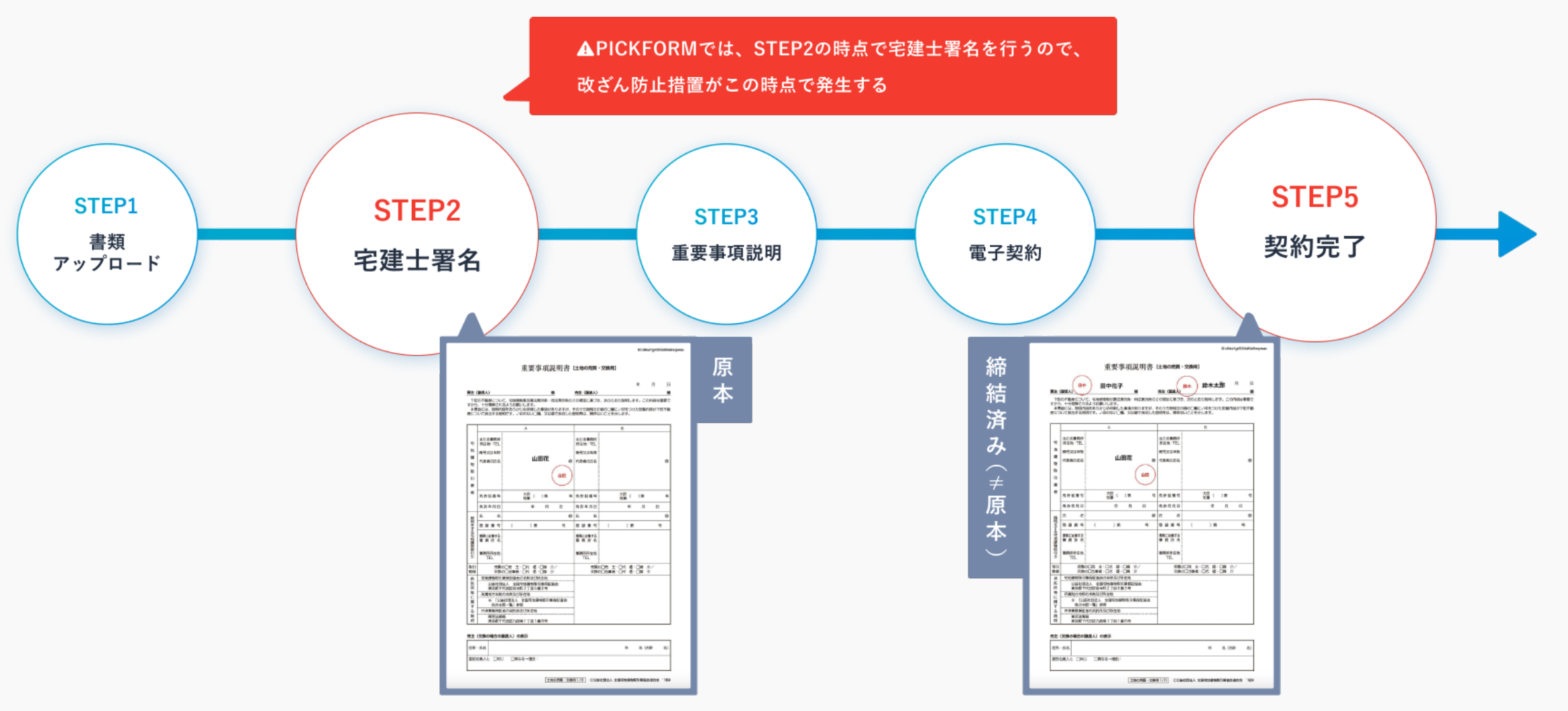 「PICKFORM 電子契約」には、重要事項説明を行う”前”に「重要事項説明書への改竄防止措置を施すフロー」が備わっており、今回、これら一連のフローを実現する技術の革新性をご評価いただき特許の取得に至りました。