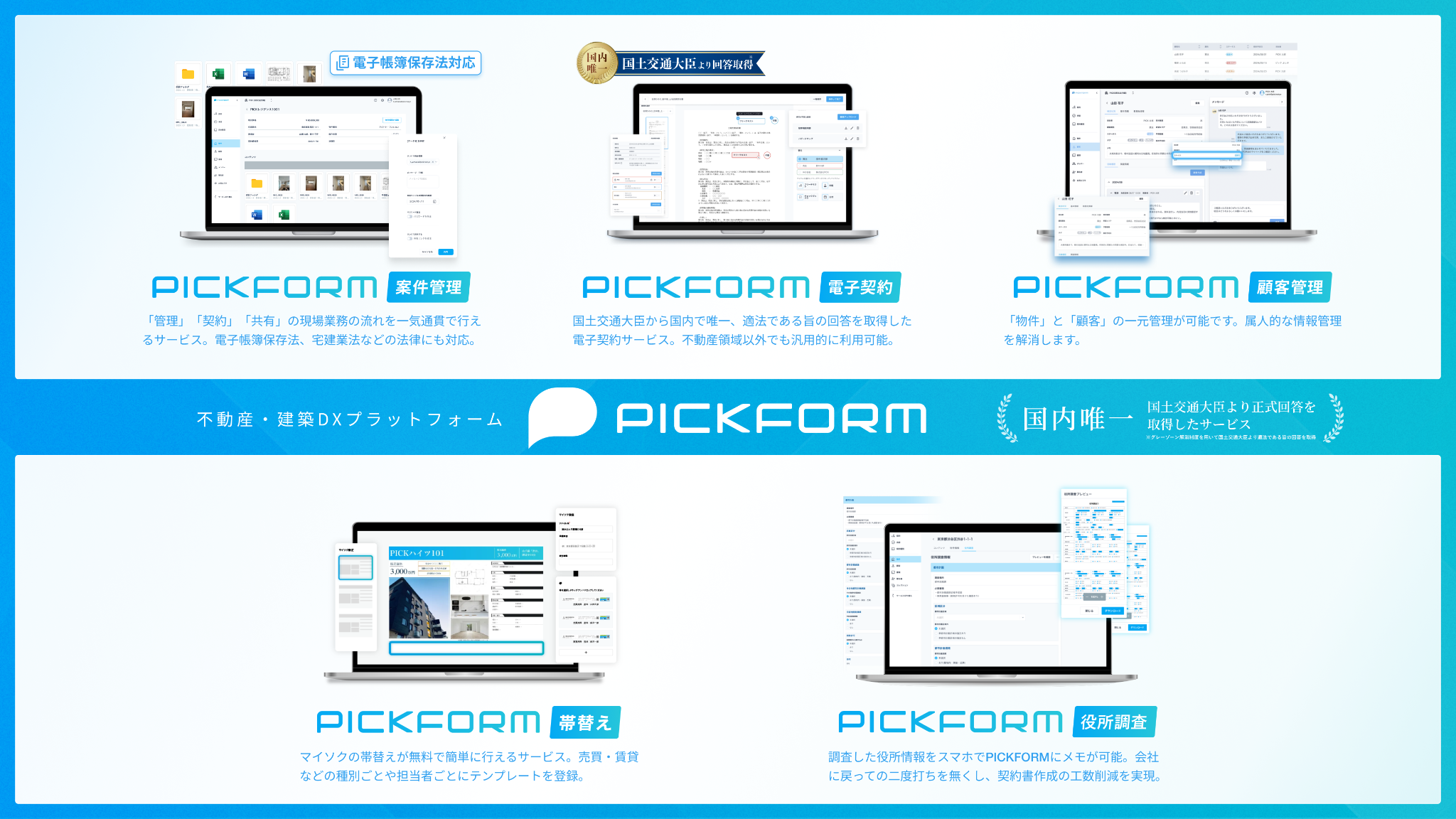 「PICKFORM 電子契約」は、国内で唯一国土交通大臣より適法である旨の回答を取得した不動産電子取引サービスです。「不動産取引を適法に」というキーワードを掲げ、皆様に正しい形で正しい取引をしていただける環境を提供できるように精進しております。