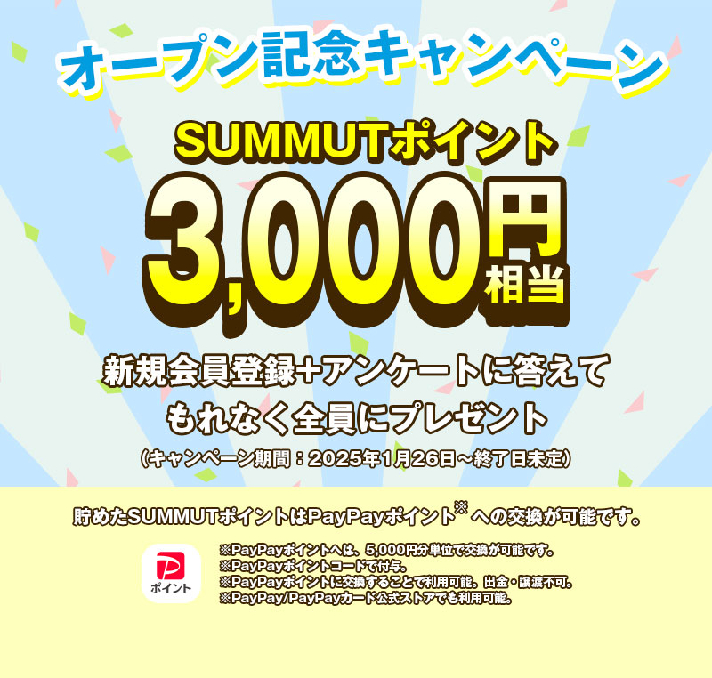 『SUMMUT』の新規会員登録+対象のアンケートに回答した方にSUMMUTポイント3,000円分をプレゼントします。