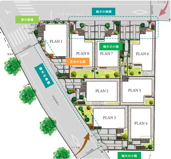 当社では、緑の環境と想いを大切にし、地元の造園学博士「神藤正人」氏の協力のもと、分譲地全体の緑化計画を行いました。
