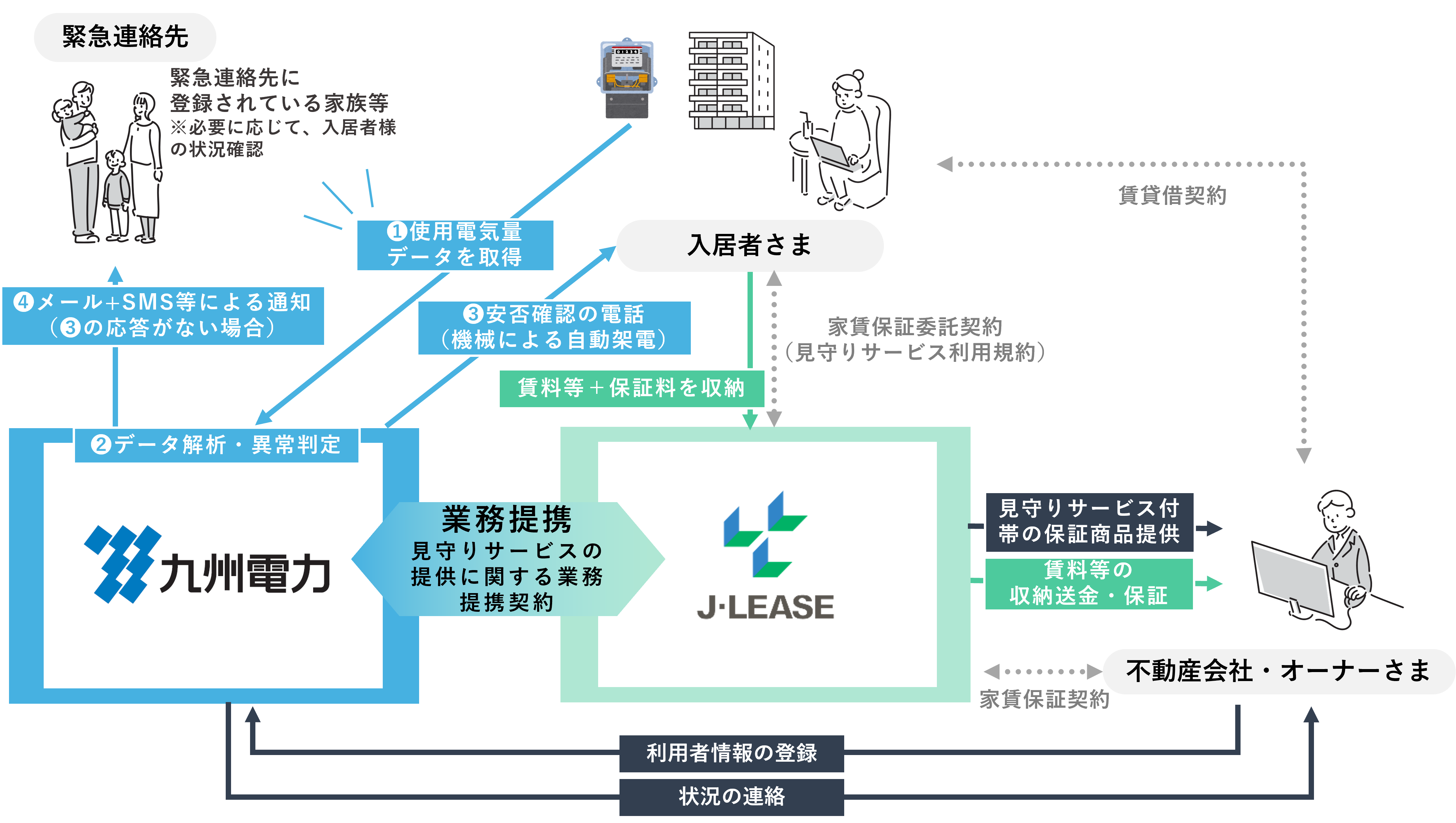 ジェイリース株式会社(本社:東京都新宿区・大分県大分市、東証プライム市場:7187、以下ジェイリース)は、九州電力株式会社(本社:福岡県福岡市、以下九州電力)と業務提携し、九州電力が提供する使用電力量データを活用した入居者見守りサービス「Q-ieまもり」の仕組みに付帯する保証サービス「Q-ieまもり for ジェイリース」の提供を開始しましたことをお知らせいたします。