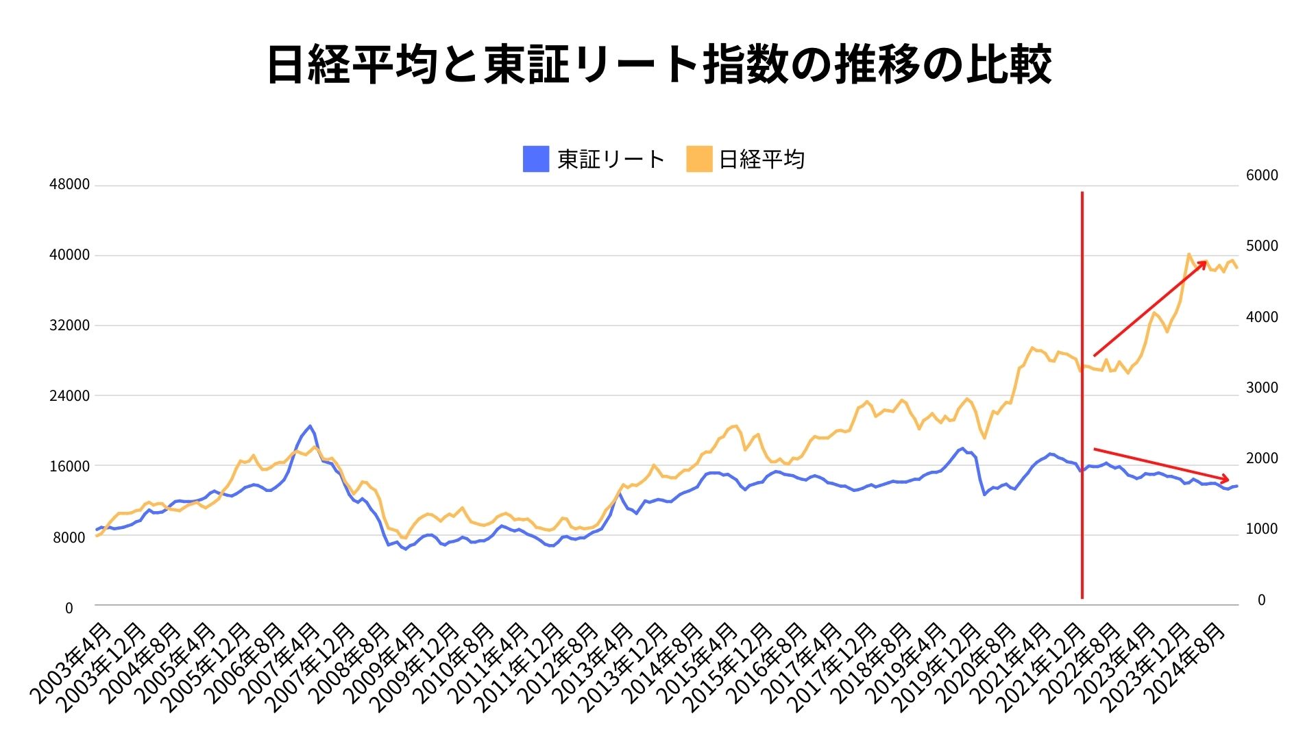 日経平均も東証リート指数も2022年までは、大きさの強弱はあるものの、同じ方向に連動して推移してきました。しかしそれ以降は、日経平均は高騰、東証リート指数は下落と相互に異なった方向に推移しています。