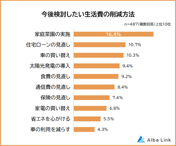 今後検討したい生活費の削減方法を聞いたところ、1位は「家庭菜園の実施(16.4%)」となりました。2位「住宅ローンの見直し(10.7%)」、3位「車の買い替え(10.3%)」、4位「太陽光発電の導入(9.4%)」、5位「食費の見直し(9.2%)」が続きます。