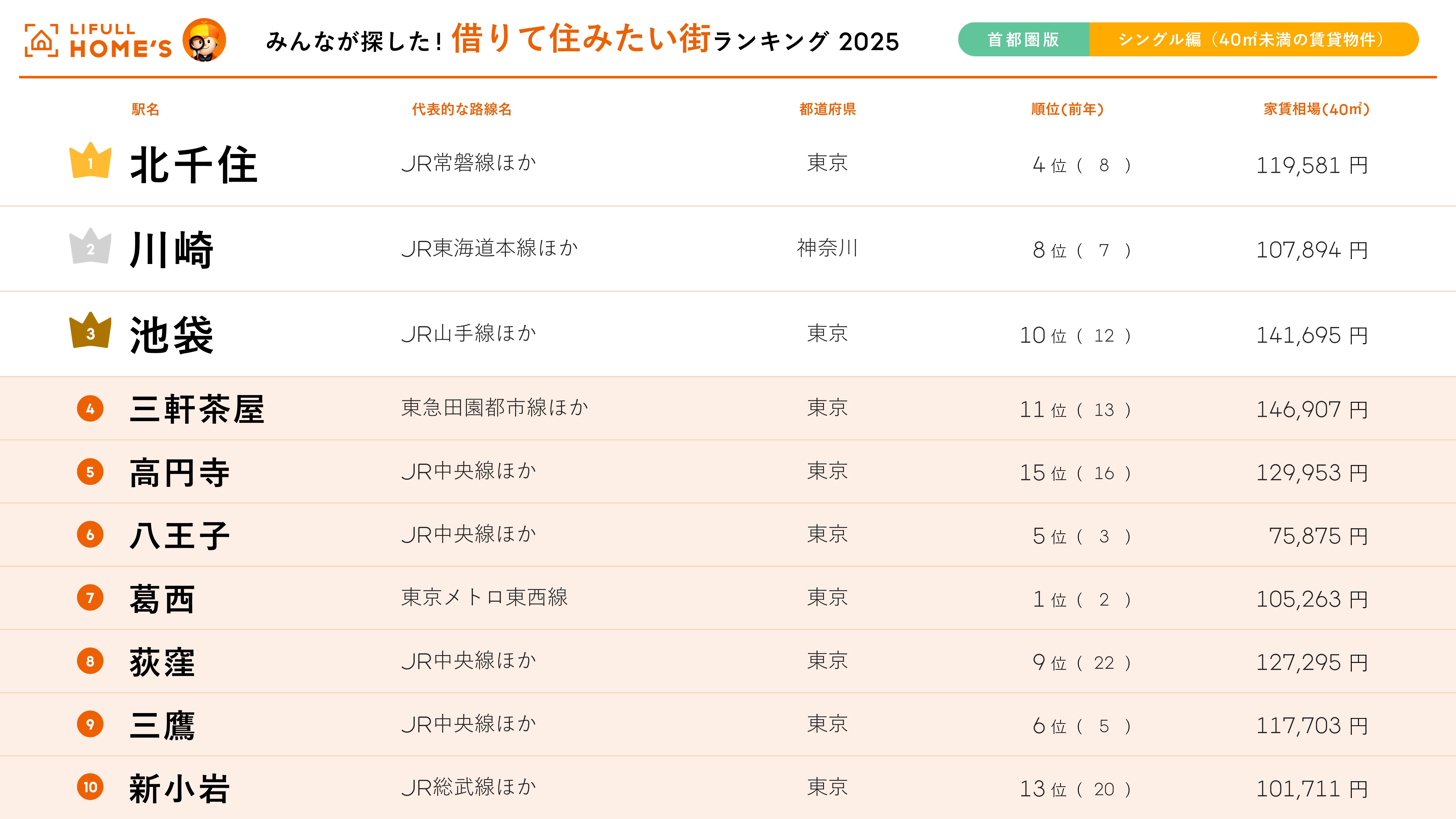 40㎡未満の賃貸物件への問合せ数を集計した「2025年 LIFULL HOME’S みんなが探した!住みたい街ランキング(首都圏版・シングル編)」の1位は「北千住」となりました。2位は「川崎」、3位にはコロナ前に借りて住みたい街で4年連続1位だった「池袋」が入りました。