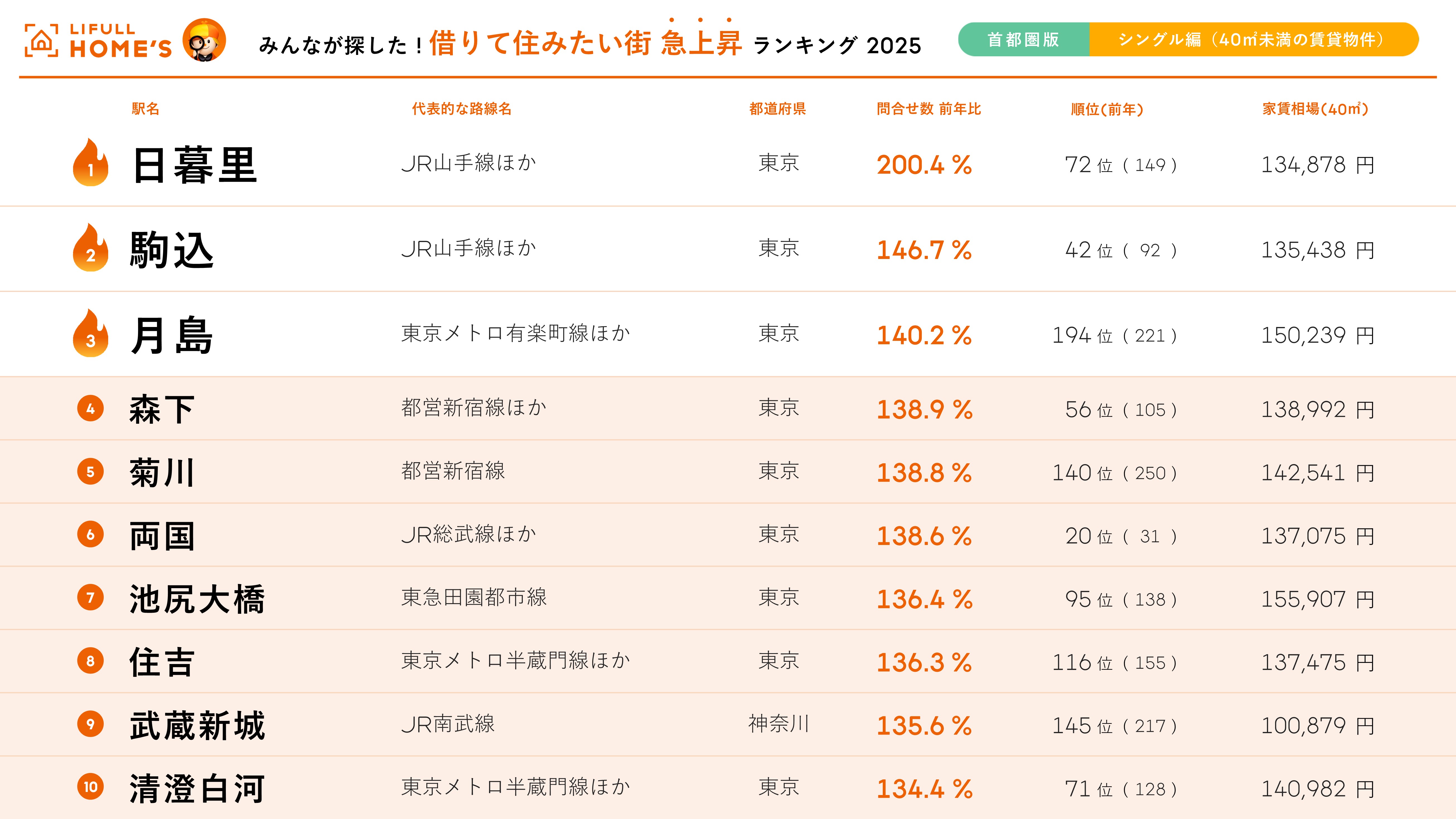 「2025年 LIFULL HOME’S みんなが探した!借りて住みたい街 急上昇ランキング(首都圏版)」と同様、TOP10のうち「武蔵新城」を除く9駅が23区内の駅で、「森下」「菊川」「両国」「住吉」「清澄白河」など都心へのアクセスが良く、賃料水準が比較的安価な「城東エリア」の駅が並んでいます。