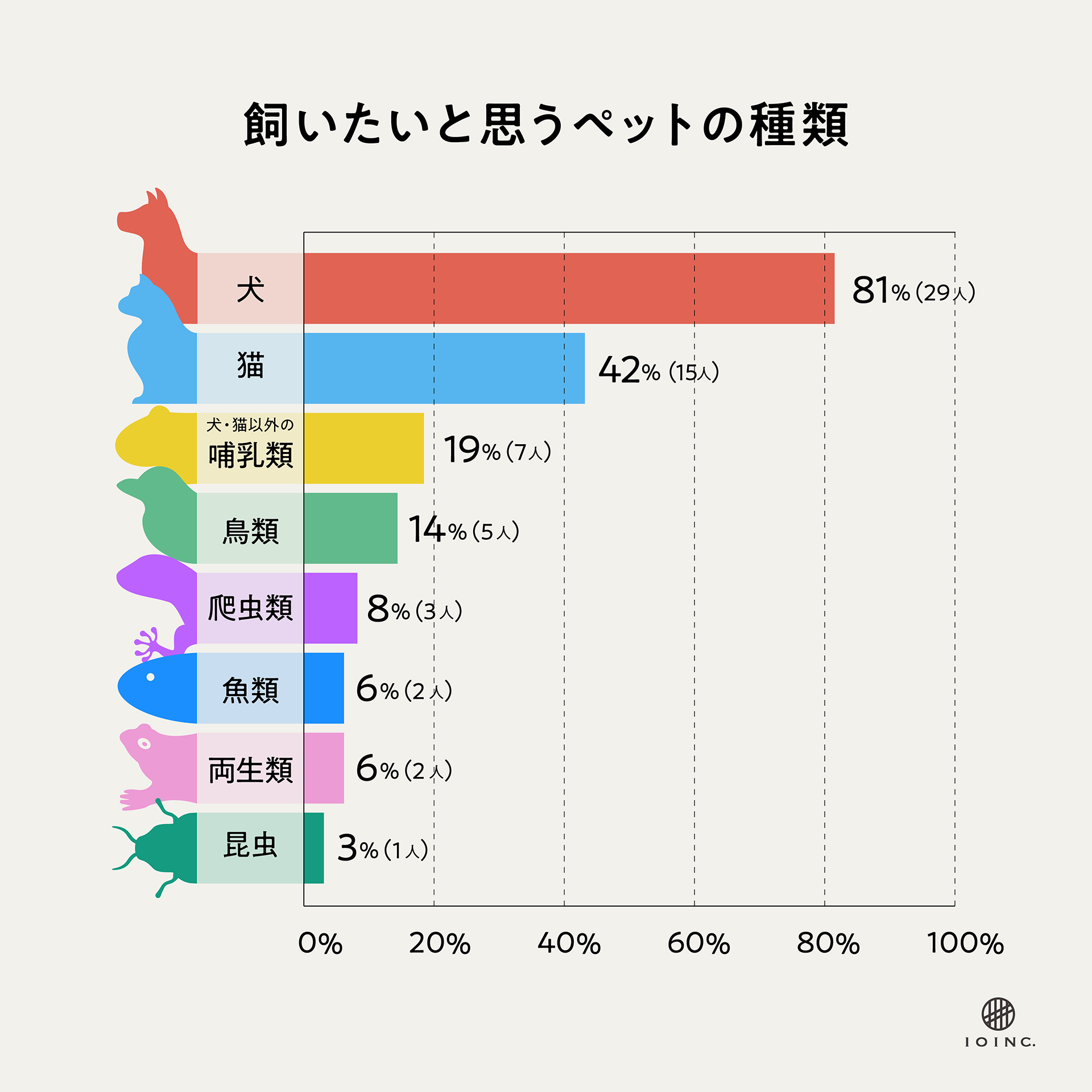 飼いたいと思うペットの種類はダントツで「犬」。2位の「猫」と倍の差がついた結果となりました。