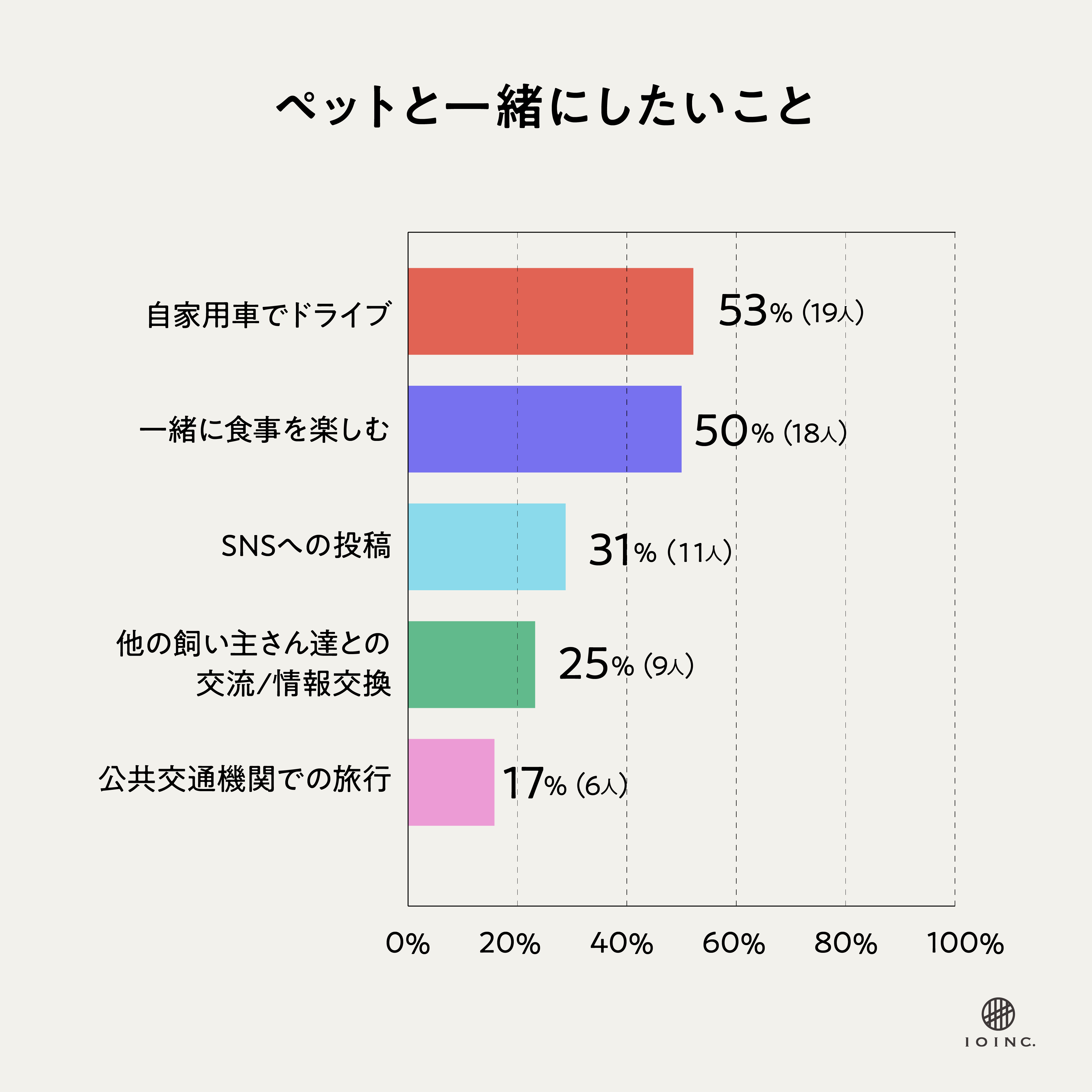ペットと一緒にしたいことは「自家用車でのドライブ」や「一緒に食事を楽しむ」が多く、家族や友人、恋人と同じような存在感です。