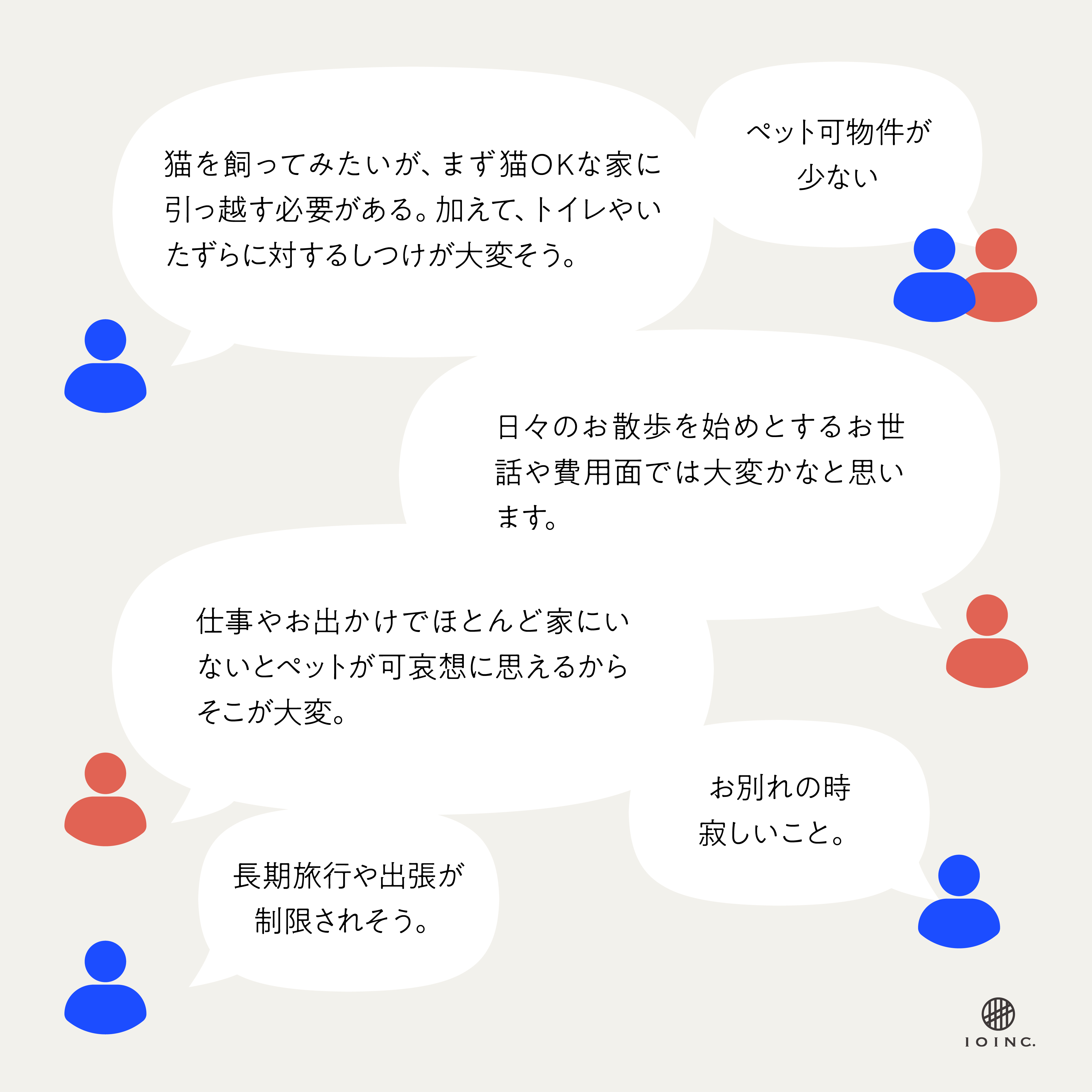 ペットを飼いたいけれど飼っていない理由(懸念点)として多くみられたのが「ペット可の物件」探しや引っ越し。次いで、飼育費用や毎日のお世話が挙がりました。ペットと暮らす住環境の確保に難しさが感じられています。