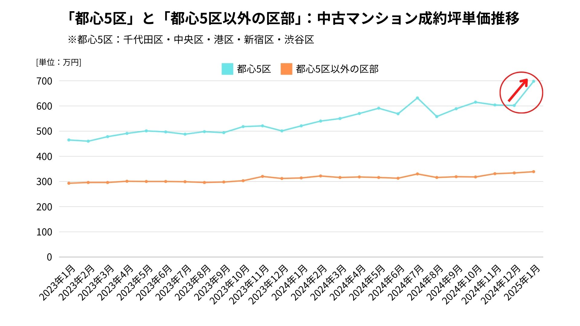 従って2025年1月の首都圏の中古マンション成約坪単価の急激な高騰は、首都圏全域の平均坪単価の高騰によるものではなく、「東京都心5区の富裕層向け中古マンション」という特定のセグメントの平均成約坪単価の急激な高騰に引っ張られて起こったものと考えられます。
