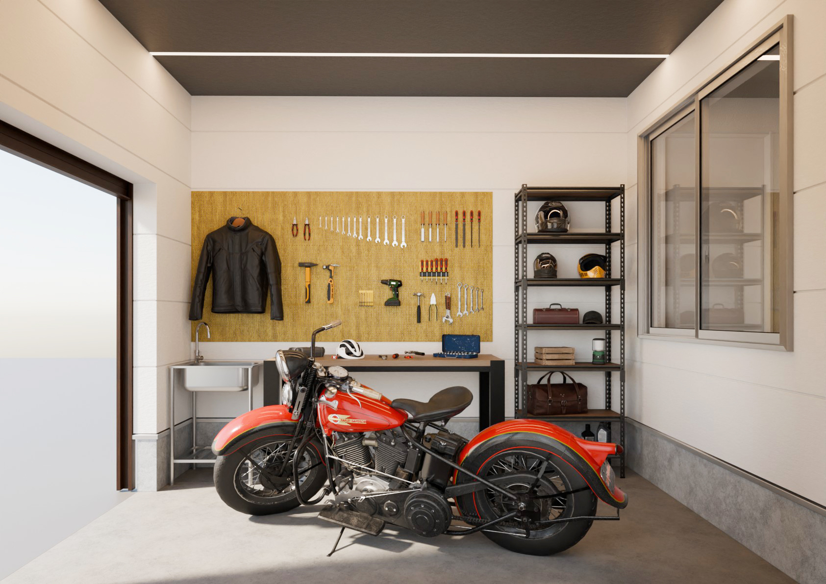 この3rdプレイスは、バイクとの時間を楽しむバイクガレージとしてだけでなく、カフェタイムを楽しむ空間や大切な家族であるペット達と過ごす空間、トレーニングで汗を流したり、瞑想で心を整える空間など、住まう人にとってのお気に入りの「3rdプレイス」として、ご自由にご活用頂けます。