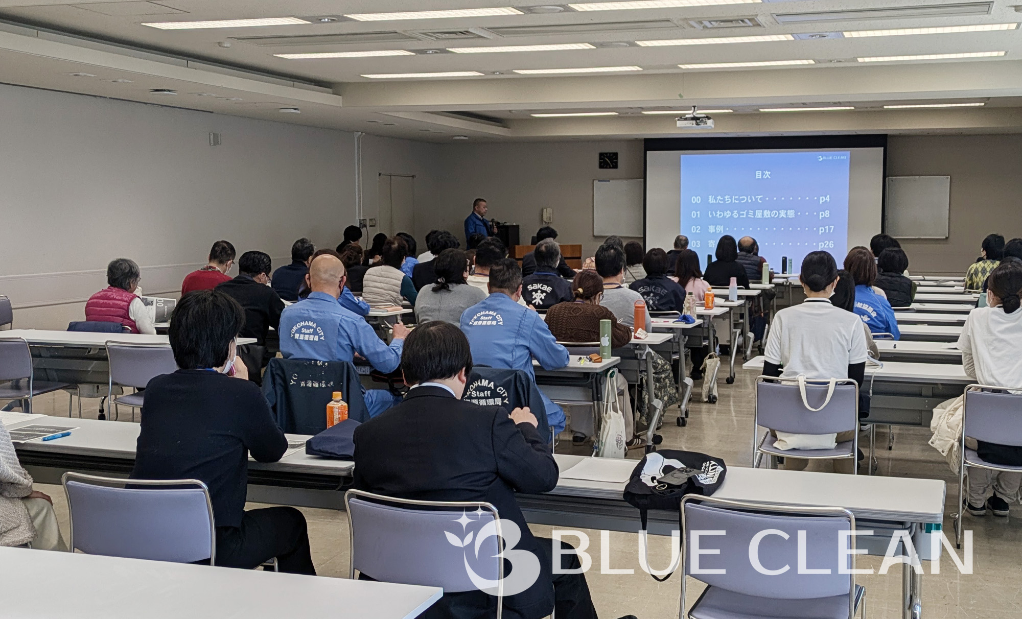 本研修は、自治体職員等が「ごみ屋敷問題の実態」や「解決への実践的な手法」を学ぶ場として開催され、ブルークリーンは講師として登壇。全国の現場で培った経験をもとに、単なる清掃にとどまらず、顧客の課題解決を目的とした「寄り添い支援」の重要性と具体的な手法を伝えました。