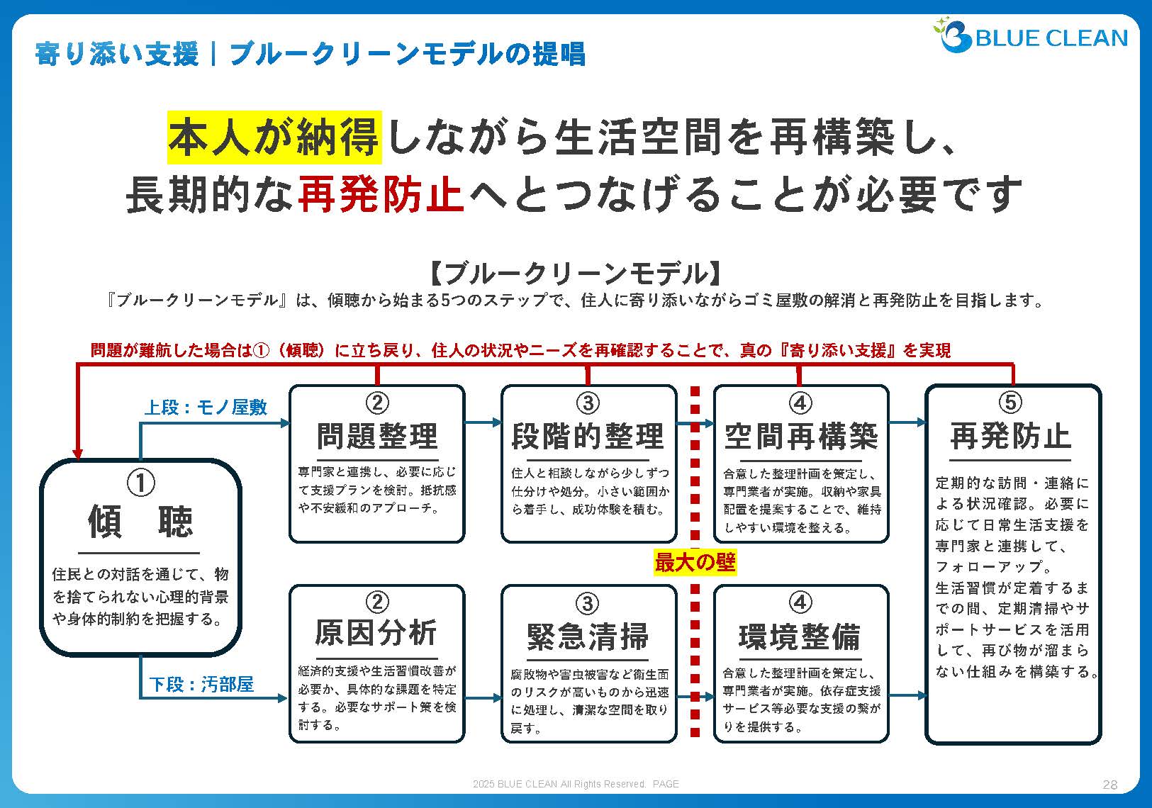 このモデルでは、まず住人との対話(傾聴)を重視し、その後、本人の納得を得ながら段階的に整理を進め、維持しやすい生活環境を構築します。また、清掃後もフォローアップを行い、再発を防ぐための支援を継続します。
